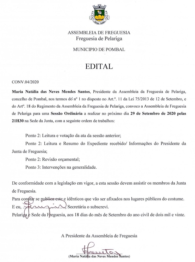 Assembleia de Freguesia - Convocatória - 29/09/2020