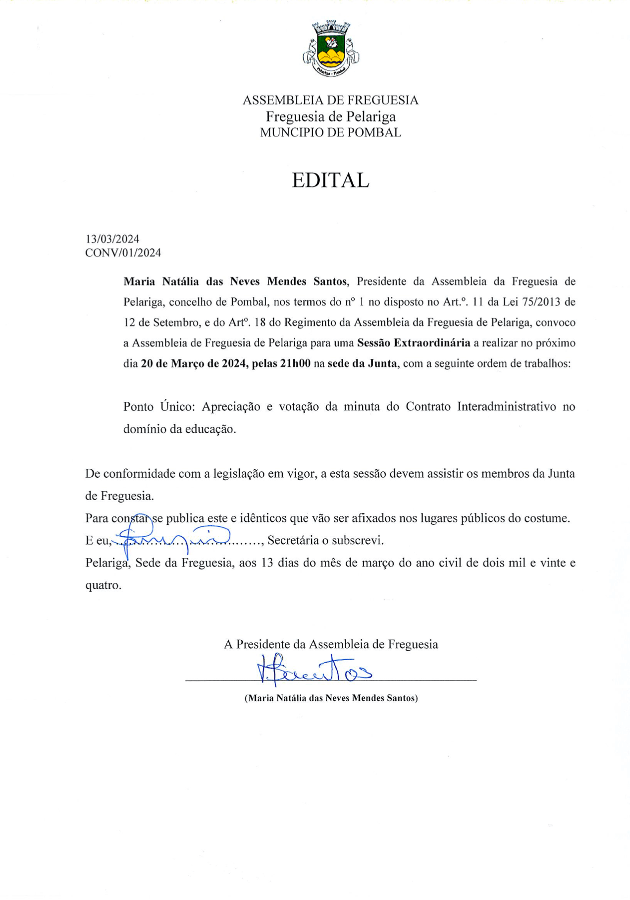 Edital - Sessão Extraordinária da Assembleia de Freguesia