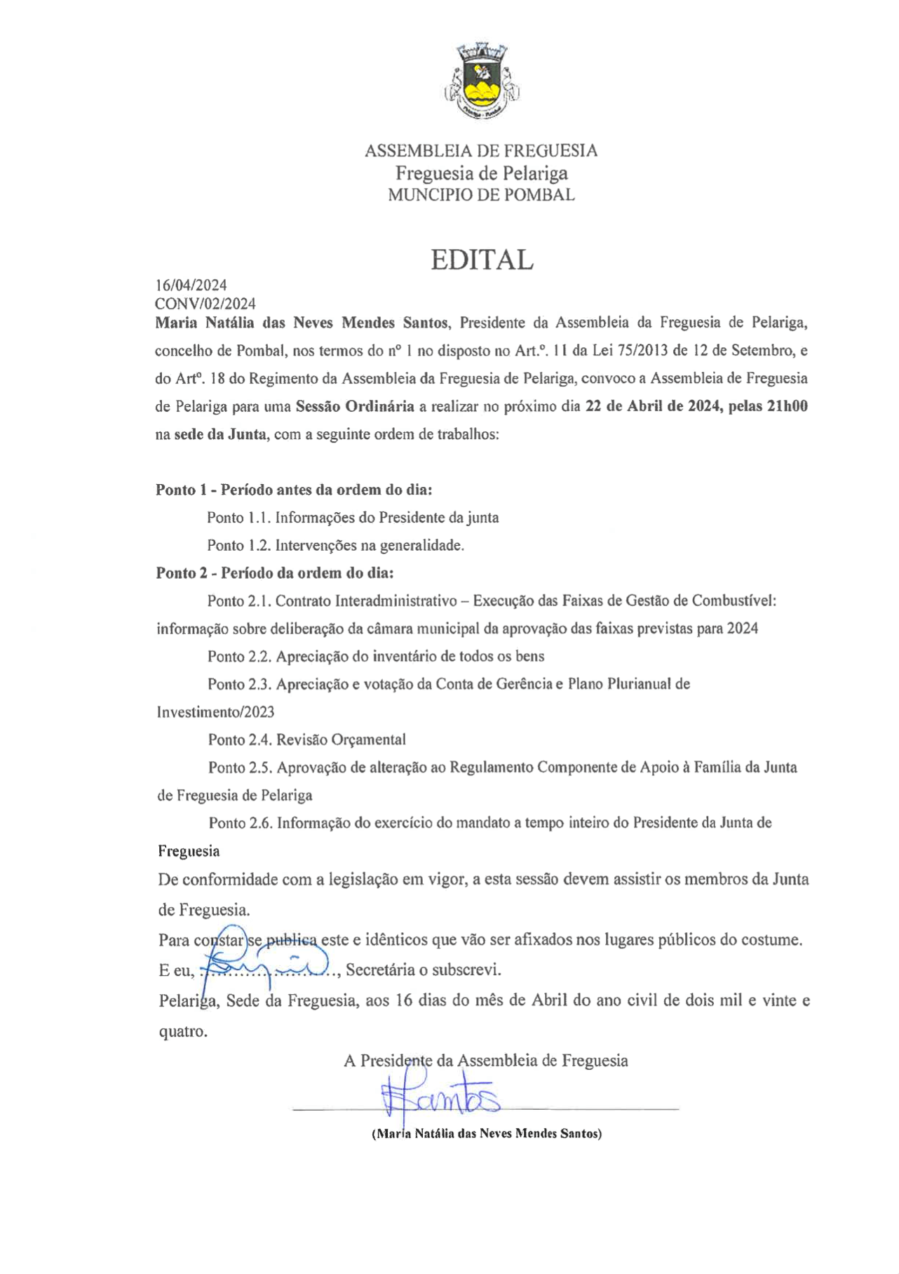 Edital - Assembleia de Freguesia de 22 de abril de 2024